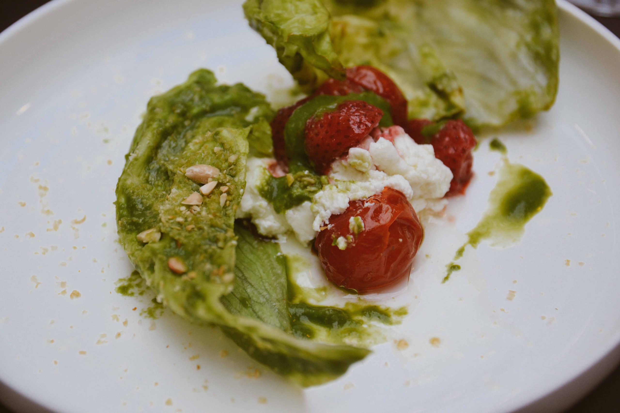 We started off with some Hibiscus-Lemon tea with lemon verbena oil, with some dried leaves to crumble to add even more of that citrusy flavour and to get your taste buds started for what’s next, along with some potato bread with egg-butter and reindeer-blood-creme (wow) which was pretty heavy but so tasty. For a proper appetizer, there was some crispy lettuce with tomato and strawberry, dark balsamico creme, goat’s cheese from Saloniemi and some crushed roasted almond on top. A perfectly light combination of fresh flavours and I immediately felt catapulted back into a bright summer night. The Sylvaner white wine that was served with it was the perfect companion for this dish.