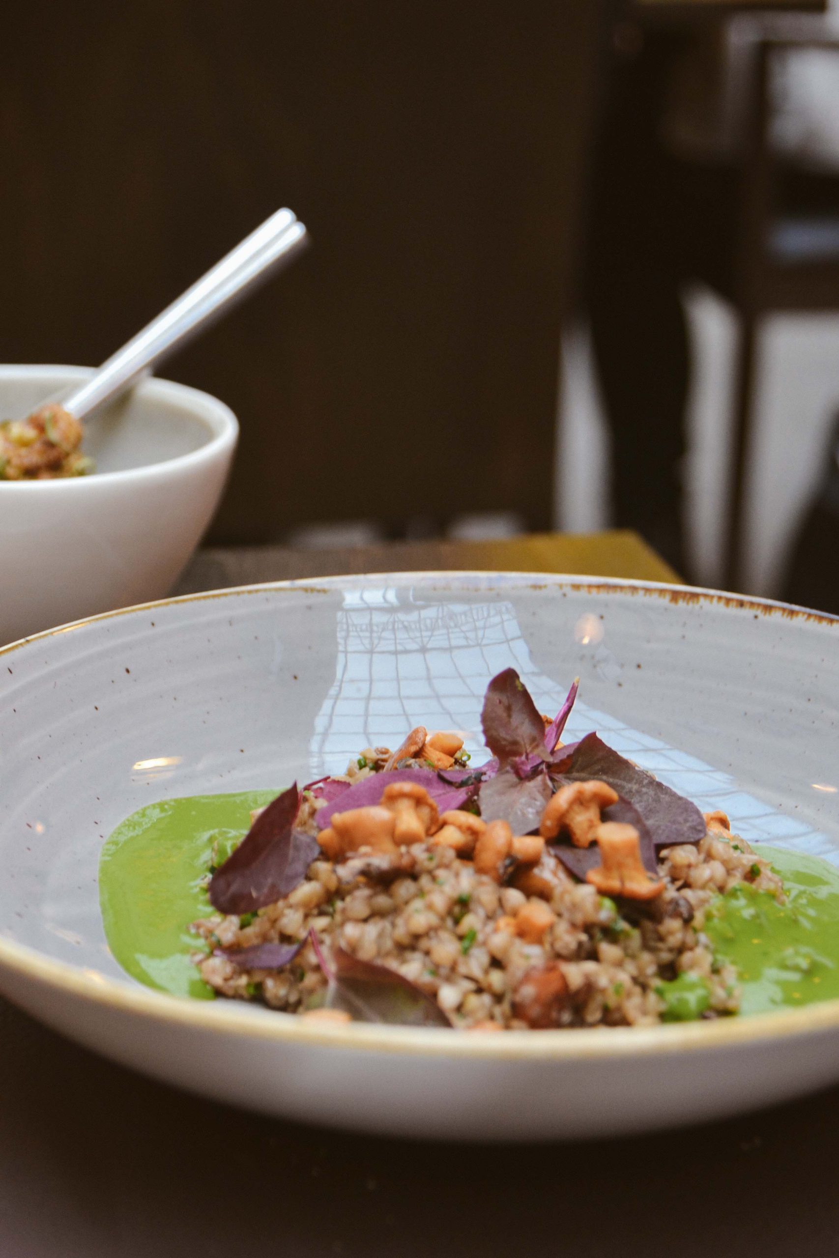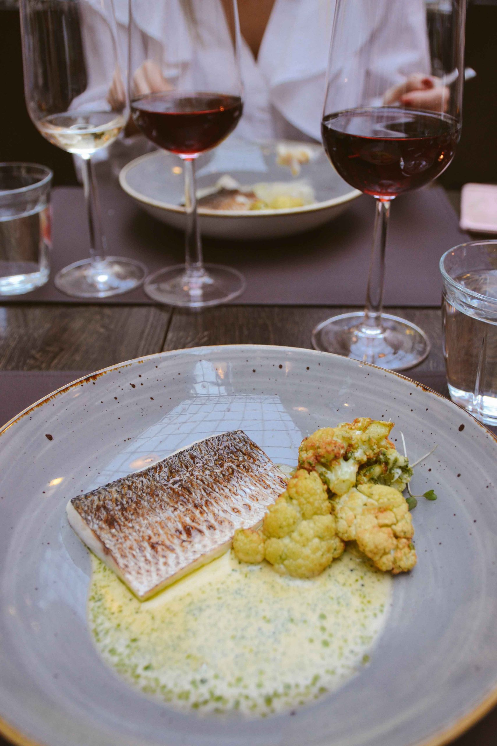 Oh, the main course! Definitely, the ultimate highlight of this evening was the char-grilled whitefish (siikaa) with the best cauliflower I’ve had in a long, long time. The butter-flavoured white wine sauce with fennel oil was just absolutely heavenly, especially with the fish, but it’s really that cauliflower that deserved the extra-shout out here! Beautifully roasted and with a consistency that is just pure culinary art. Yes, I’m still talking about the cauliflower! Isn’t it remarkable that a seemingly simple vegetable can be turned into a dish that’s just really something else. Our vegan friend was served with a delicious buckwheat porridge with some pickled chanterelles – kindly we got a little taste of this one too – and it was absolutely fantastic as well. Glad to see that vegan options are not an obstacle here! Even though the fish would normally call for a white wine to go with it, the sommelier poured us an amazing German Spätburgunder which was wonderfully smooth and aromatic, without overpowering the otherwise light meal.