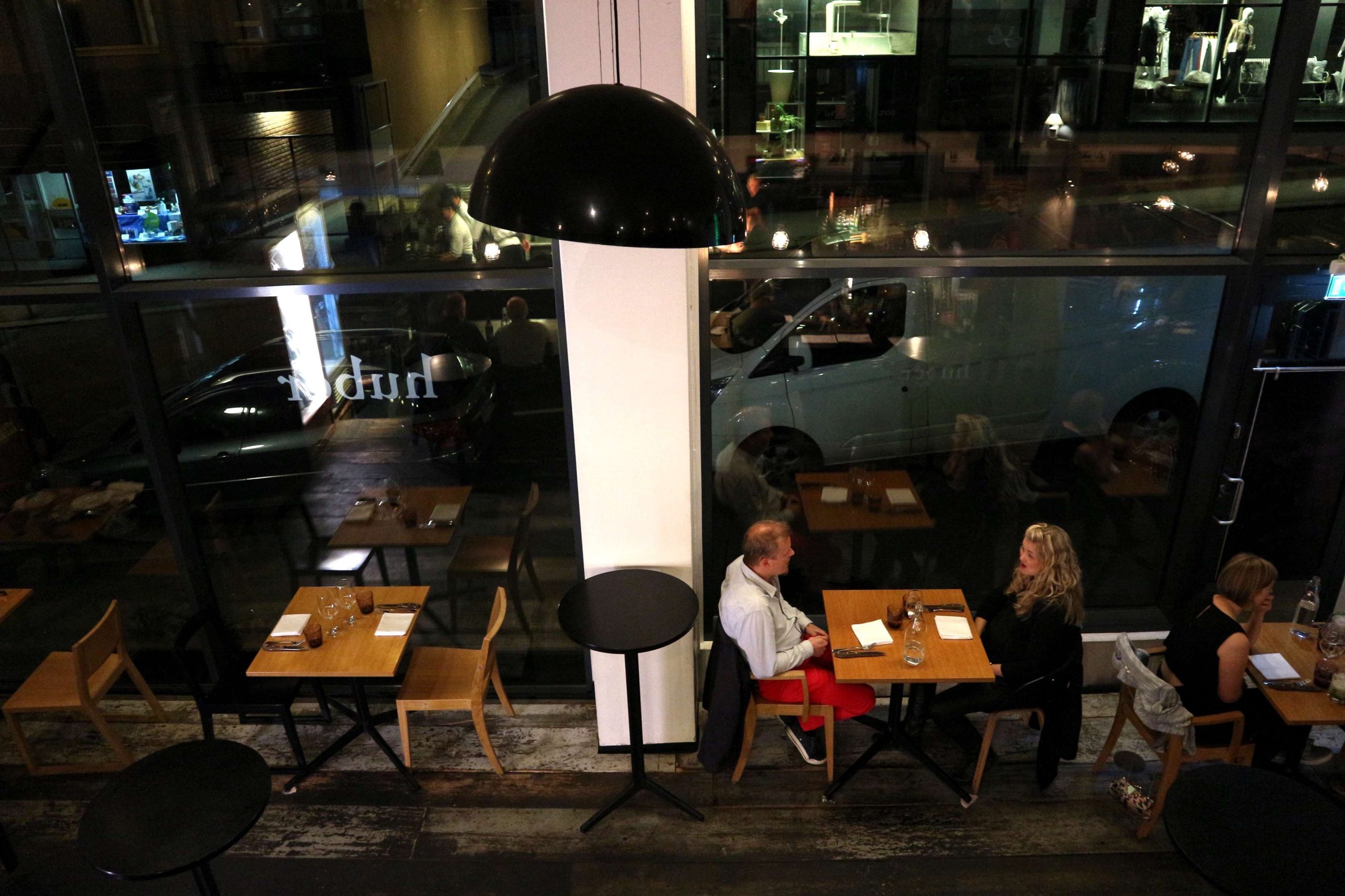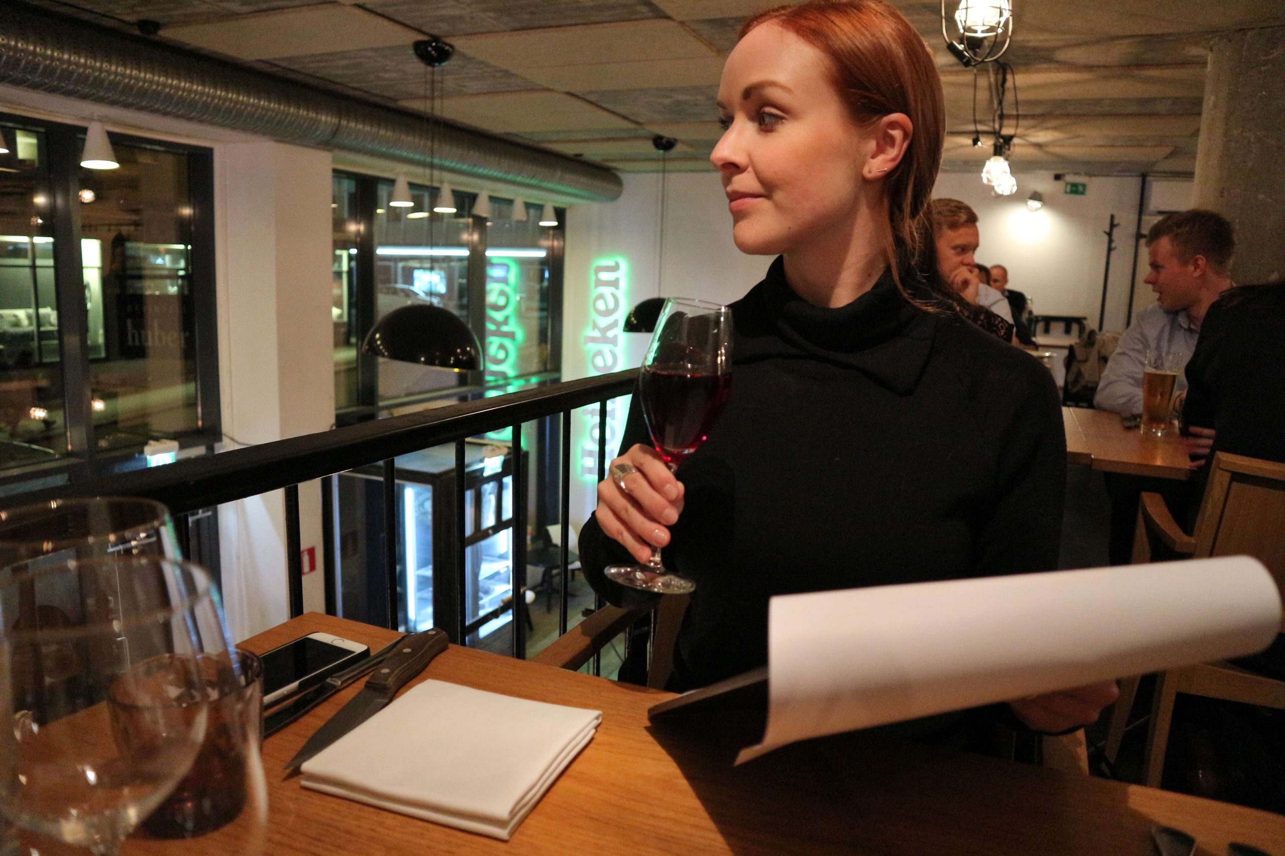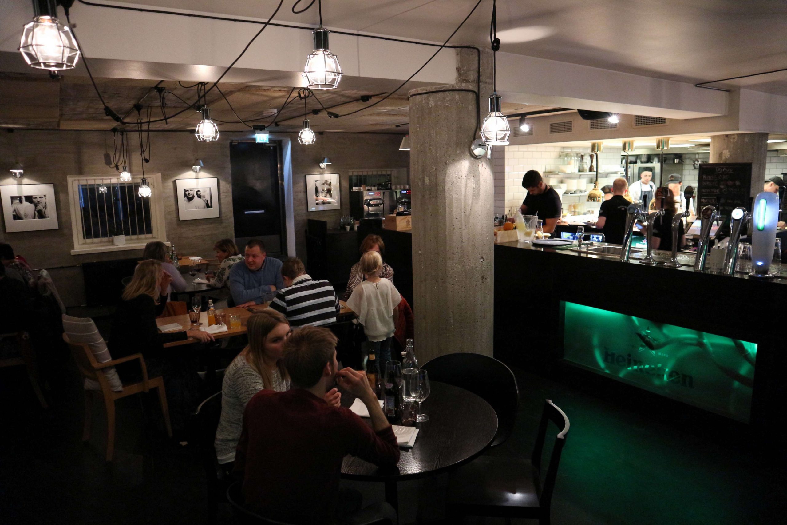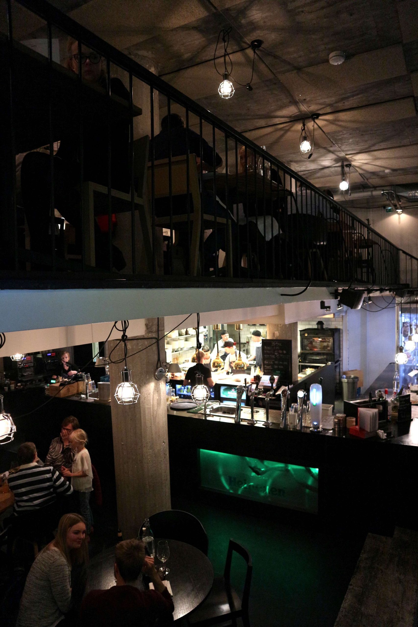 The design of the place is industrial-nordic, concrete pillars, a concrete ceiling, the open gallery that makes the second floor of the restaurant, gives it an open vibe, yet with smart lighting the place doesn’t feel cold but cozy and comfortable. The huge window front helps too!