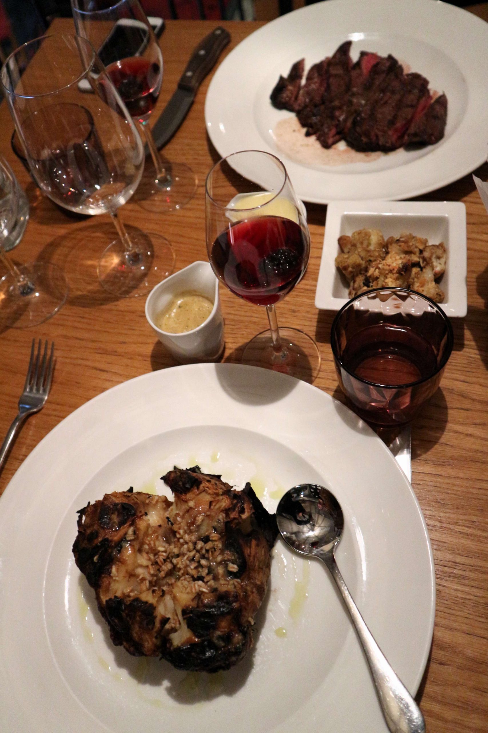 As for the main course, we were surprised by a wide selection of different sides, while I opted for the prime rib steak and the vegetarian option was a massive baked celeriac, which impressed both of us! Having expected a small breaded slice of celery, this was a positive difference. As the whiff from the charcoal grill already predicted, the meat was cooked to absolute perfection and it clearly shows that the guys in the kitchen know what they’re doing. Tender and flavourful, with only basic seasoning, the taste of the meat was underlined with the slight crisp charcoal lining.