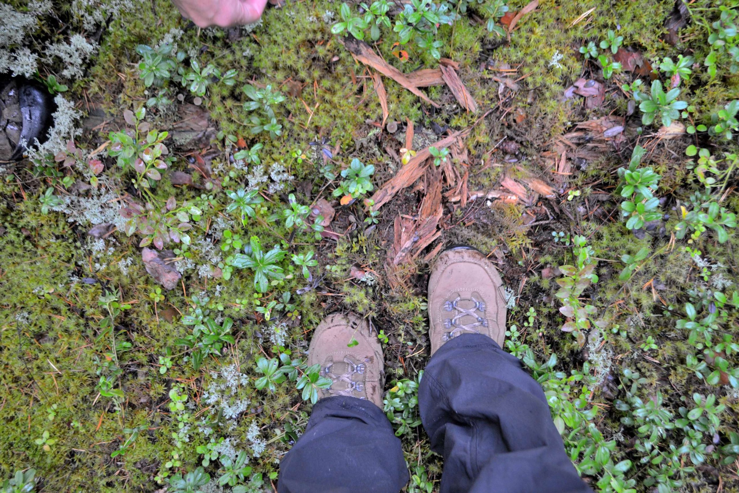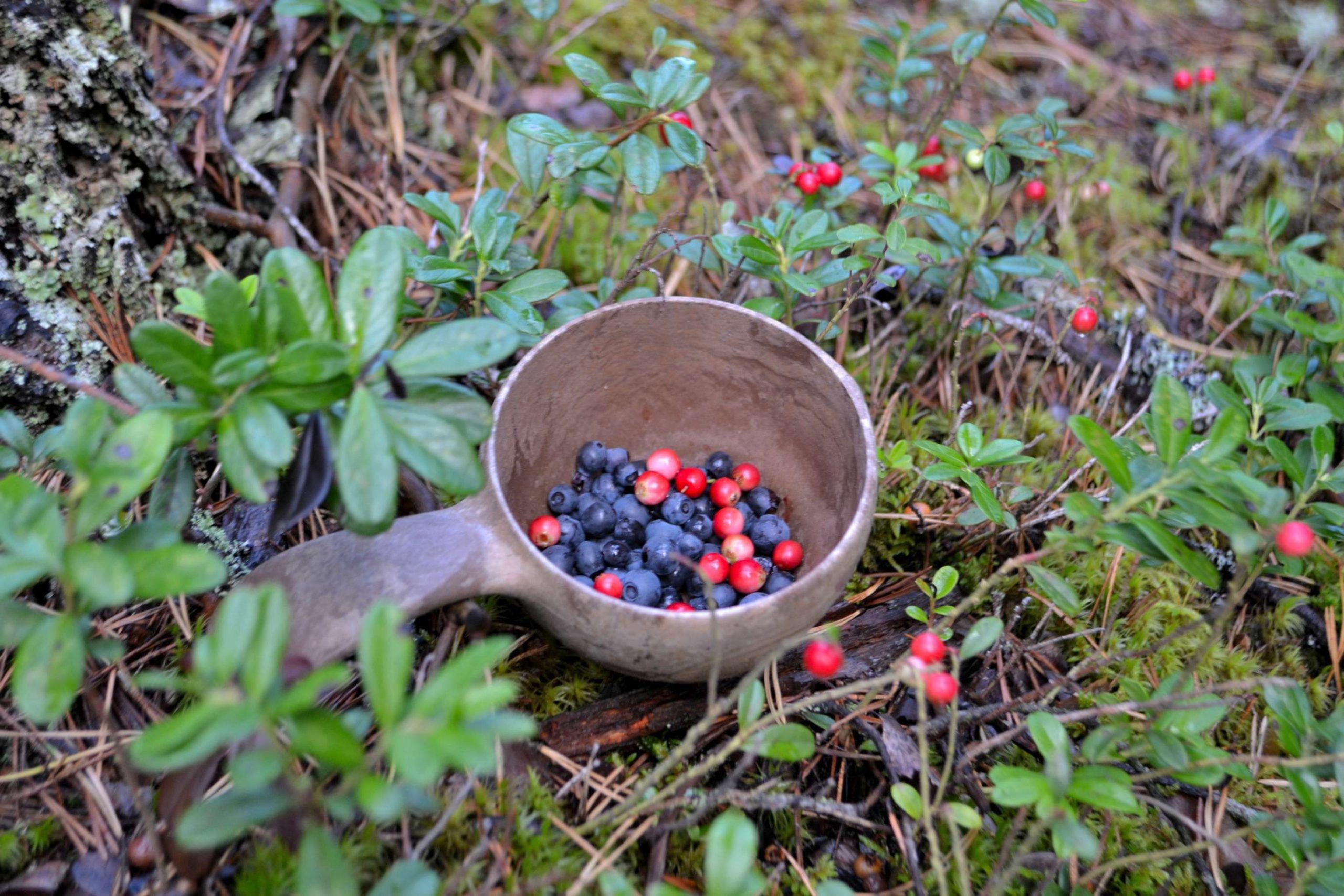 Von den Beeren gabs allerdings genug. “Preiselbeeren wachsen gerne an trockeneren Stellen, die Blaubeeren hingegen mögen es lieber feucht”, erklärt Olli. “Die Preiselbeeren haben eine tiefdunkelrote Farbe wenn sie reif sind. Je kleiner Blaubeeren sind, desto besser sind sie. Gerade gegen Ende des Sommers werden sie größer, aber auch wässriger.” Er gab uns kleine hölzerne Tassen um unsere Beeren zu sammeln, also los gings.