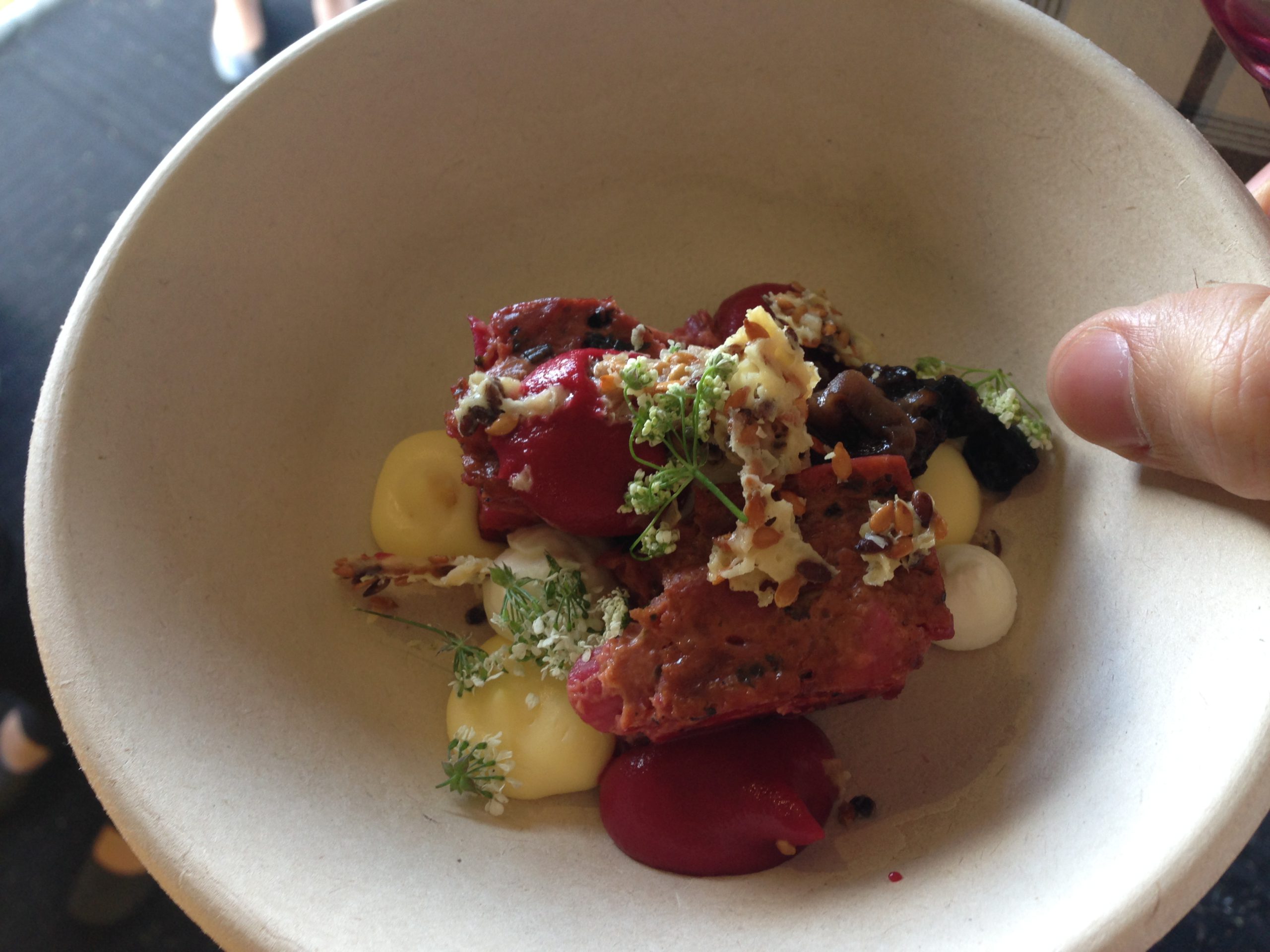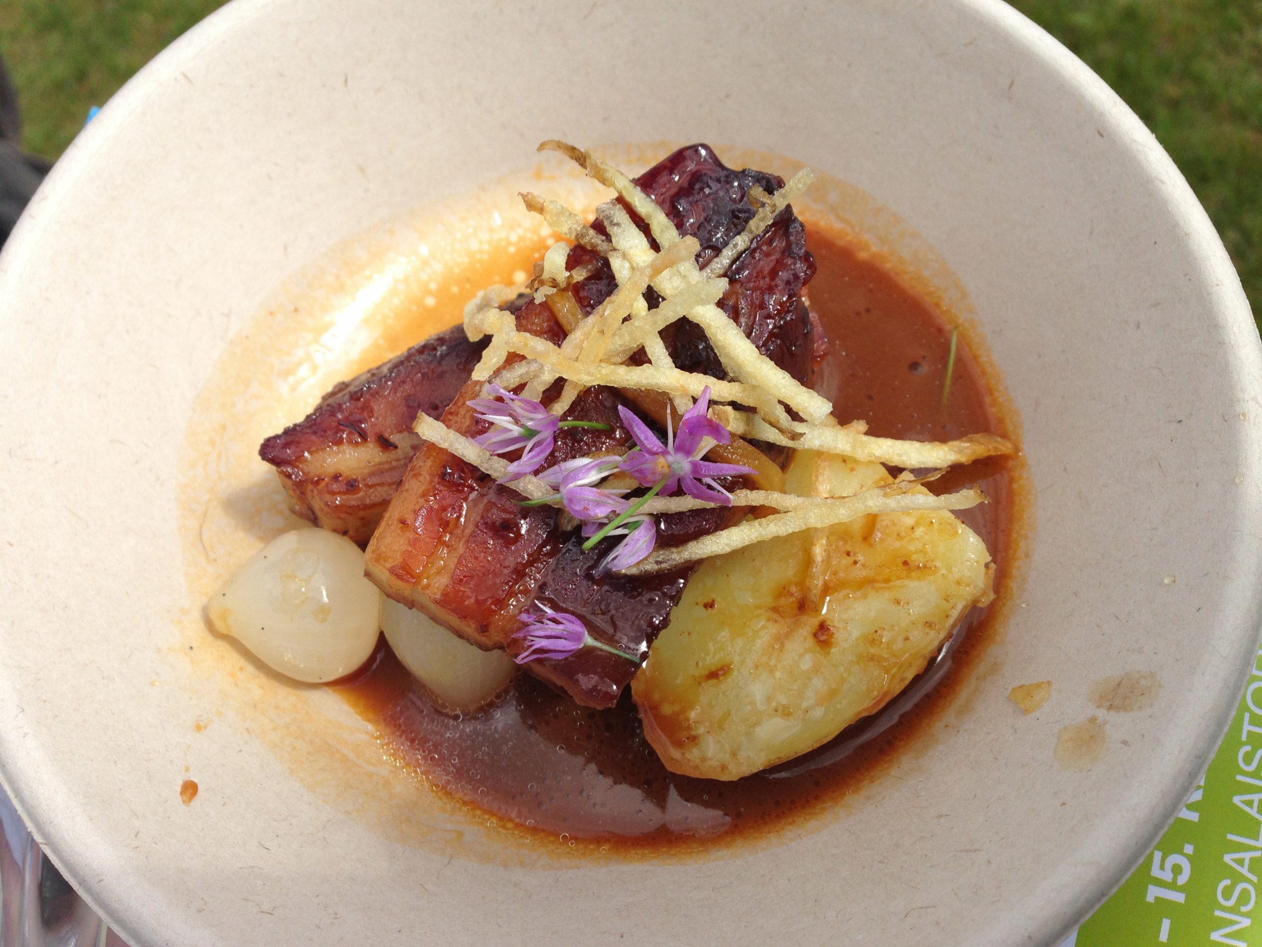 Luckily we had tickets for the brunch seating on Sunday – certainly the best day after the rainy and stormy week. As for the menus – last year I would’ve easily had almost everything – this year it was much easier for me to choose. Two trends where dominant throughout this years’ Taste of Helsinki, being goatmilk stuff and pork belly meat, I am not complaining, although my taste buds seemed somewhat immune to the seemingly distinct taste of the goat milk desserts, pork belly makes me happy every time. Also liquorice had quite a strong presence this year – very Finnish, thankyouverymuch.